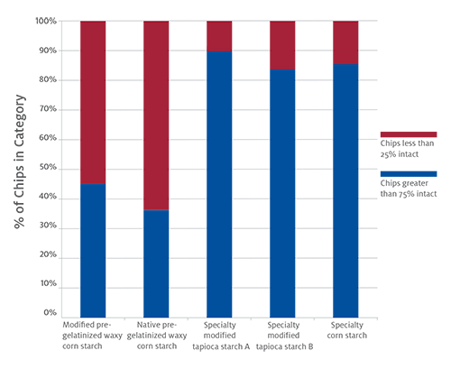 Fortunately, there are specialty starches that can provide the same dough and sheeting properties as the pregelatinised starches, but deliver a more resilient sheeted snack more likely to survive agitation and abuse. These specialty starches, listed in Figure 3, were evaluated in the breakage study.