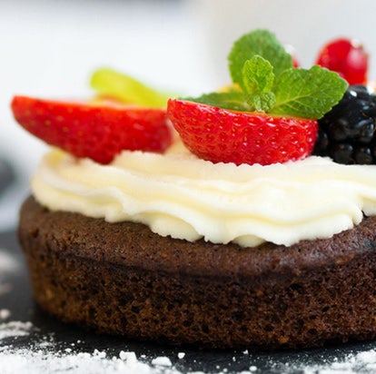 A layered chocolate mousse cake with chocolate drips and topped with fresh berries
