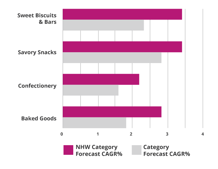 Se espera que el negocio de los snacks que se centran en la nutrición, la salud y el bienestar crezca a un ritmo mayor que el de los snacks tradicionales (TCAC% 2021-26)3